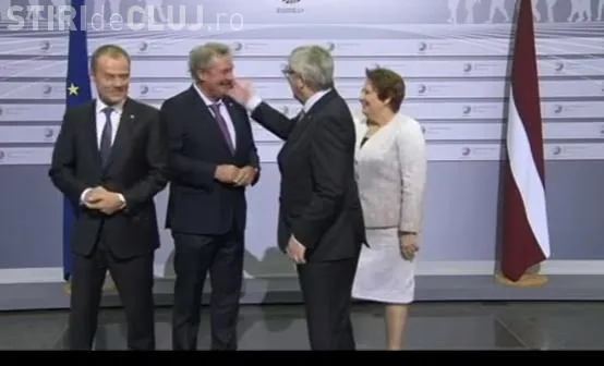 Prezent în faţa camerelor de filmat alături de Donald Tusk, Preşedintele Consiliului European şi Laimdota Straujuma, primul ministru al Letoniei, ţara gazdă a summitului din 2015, Jean-Claude Juncker a făcut câteva gesturi mai mult decât prieteneşti ce păreau a fi desprinse din cadrul diplomatic cerut de eveniment.