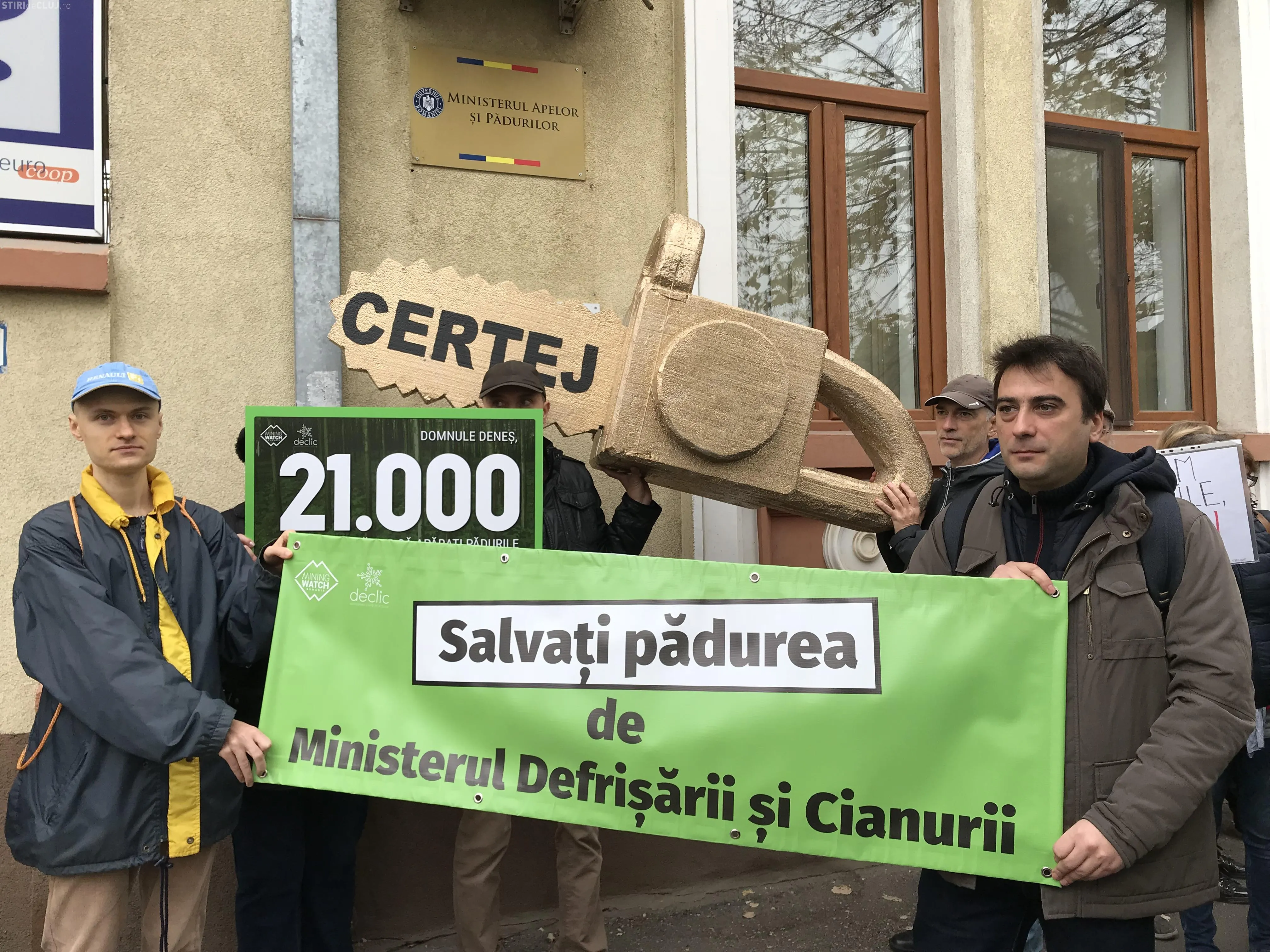 Membrii comunității Declic și activiștii Mining Watch România au predat reprezentanților Ministerului Apelor și Pădurilor o drujbă de aur, în semn de protest față de proiectul de aprobare a defrișării a peste 56 de hectare de pădure în comuna Certeju de Sus, jud. Hunedoara.