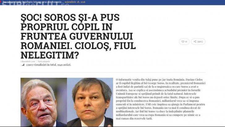 Un site obscur, neasumat de nimeni, a publicat știrea ”Soc! Soros si-a pus propriul copil in fruntea guvernului Romaniei. Ciolos, fiul nelegitim?”. Informația s-a viralizat și a adunat 23.000 de vizualizări, fara sa fi fost preluat de vreun alt site de stiri, fie ele si false, scrie hotnews.ro