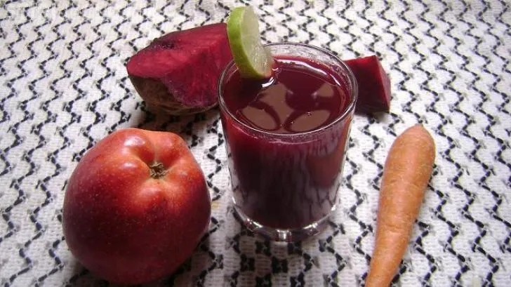 Pentru a face acest suc, ai nevoie de o sfeclă roşie, un morcov şi un măr, toate crude. Se spală bine, se taie cubuleţe, se pun în blender (cu tot cu coajă) cu puţină apă plată şi sucul se bea imediat.