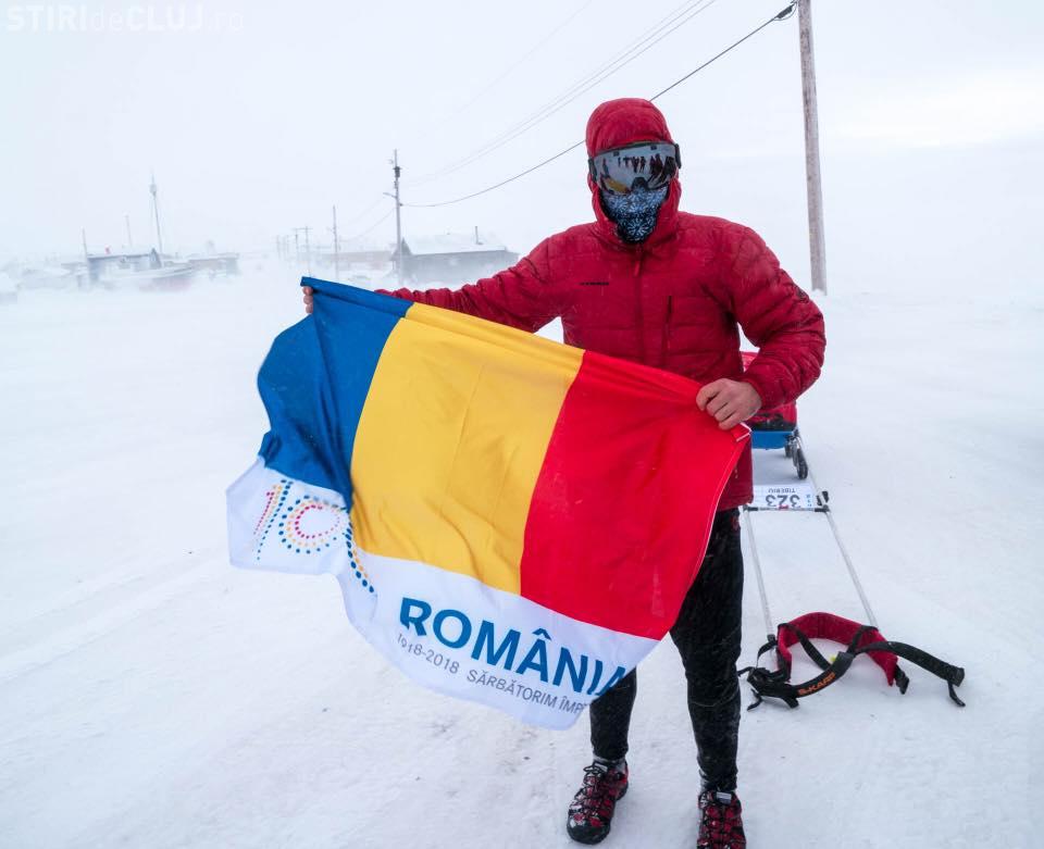 Tiberiu Uşeriu a trecut linia de start fluturând steagul României, care avea însemnele Centenarului Marii Uniri.