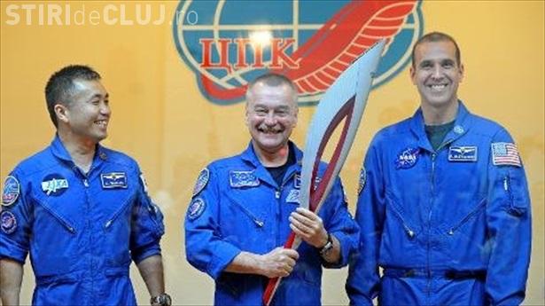 Trei astronauți decolat în această dimineață într-o navetă rusească de tip Soiuz, purtând cu ei torța olimpică, care va fi purtatp în spațiu pentru prima dată în istorie.