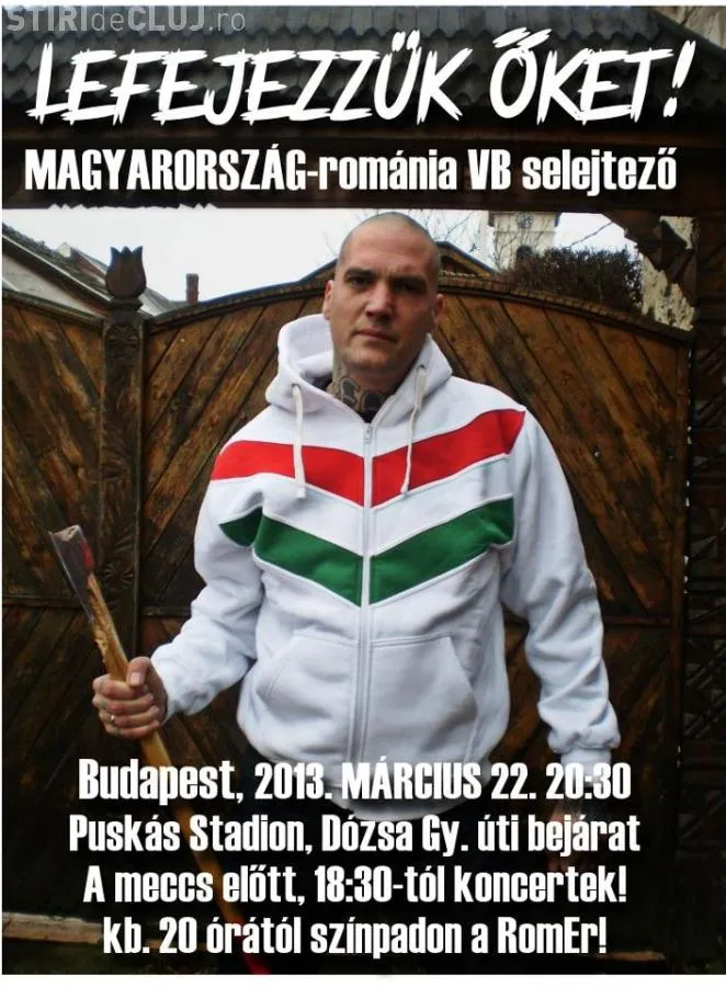 Afișul pe care apare un ultras maghiar cu o secure în mână promovează concertul care va avea loc înainte de meciul Ungaria - România. Numele țării noastre este scris cu litere mici, ca și când nu ar fi important, în timp ce numele Ungariei cu majuscule.