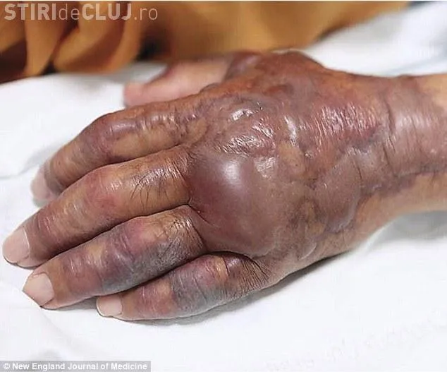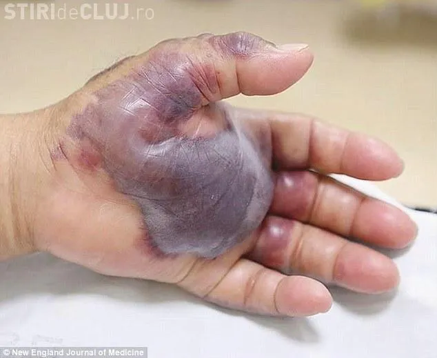 La 12 ore după ce a consumat pește, mâna bărbatului s-a umflat și a început să îl doară extrem de tare. Vânătăi uriașe și bășici i-au apărut pe piele după ce a mâncat carnea crudă de pește. Medicii i-au curățat bășicile și au îndepărtat țesutul infectat, administrându-i antibiotice.