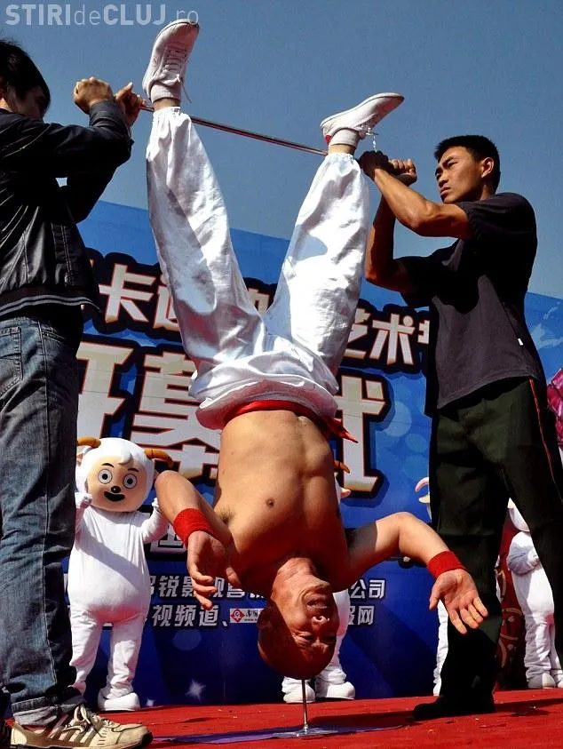 Un chinez de 47 de ani a uimit pe toata lumea cu un exercitiu periculos, dar spectaculos. El a perfectionat o tehnica, prin care reuseste sa stea in cap intr-un cui.