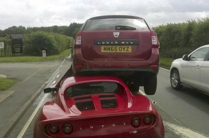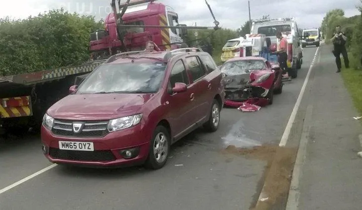 Accidentul a avut loc pe A1433 în Holt Heath, lângă Worcester. Șoferul Daciei a aterizat pur şi simplu pe acoperişul bolidului, iar impactul a fost atât de puternic, încât martorii au auzit o bubuitură puternică. Unii au crezut că a avut loc o explozie.