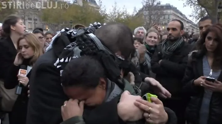 Zeci de oameni l-au îmbrățișat în Piaţa Republicii din Paris, unde oamenii aduceau un omagiu victimelor atentatului de vineri seara.
