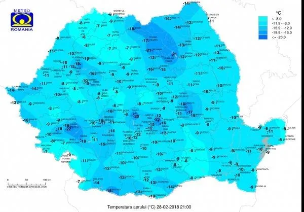 Meteorologii au prognozat că noaptea de 28 februarie spre 1 martie ar putea fi cea mai rece din această iarnă. Datele oficiale ale ANM confirmă vreme polară care a lovit România.