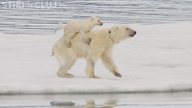 Ecologistii WWF surprind eforturile pe care le fac ursii polari de a lupta impotriva incalzirii globale. Marile mamifere albe au ajuns sa isi care in spate puii, pentru a-i apara de frig.