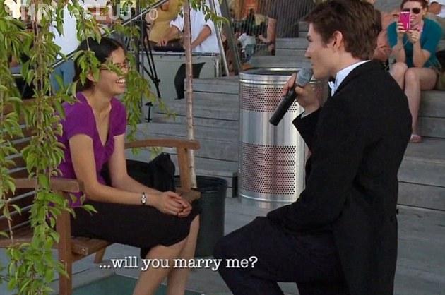 Scena a fost filmată de ”Jack din Boston”, autorul acestui flashmob. El i-a dat întâlnire prietenei sale la Institutul de Artă Contemporană. Ajuns la locul stabilit, cu braţele pline de flori şi cu muzică pe fundal, Jack s-a furişat prin spatele ei, îmbrăcat la costum, a îngenuncheat şi a întrebat-o dacă vrea să se căsătorească cu el.