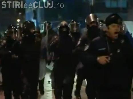 Imaginile au fost surprinse in Bucuresti, in cea de-a patra zi de proteste. Manifestantii au fost pusi pe fuga de un grup de jandarmi, condusi de un barbat corpolent care isi indemna colegii la atac.