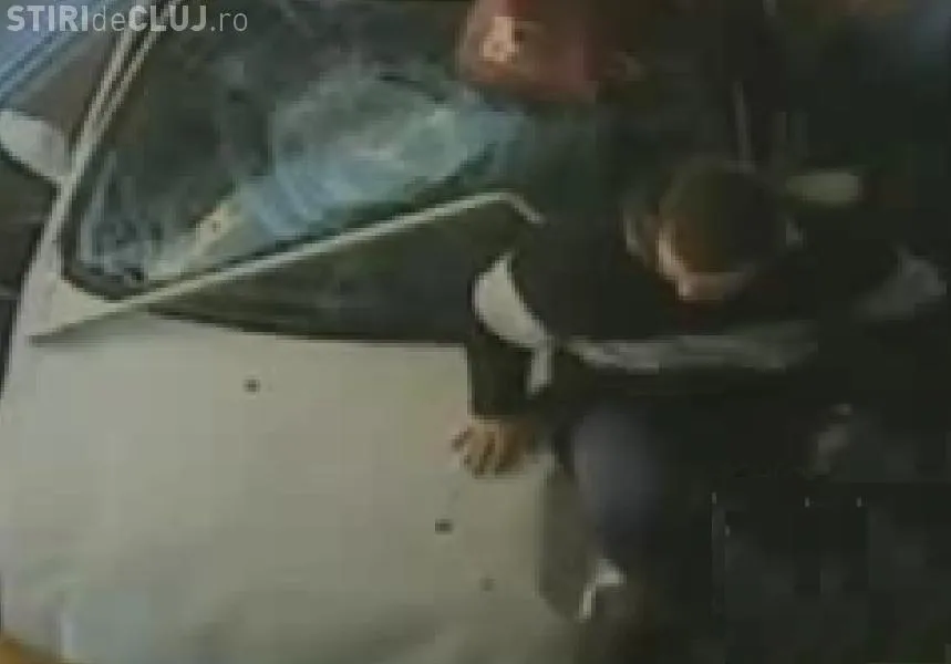 Accidentul a fost surprins de camerele de supraveghere, unde se vede cum barbatul si-a luat copilul in brate si s-a intors cu spatele spre masina care venea pe trotuar, pentru a-l apara.