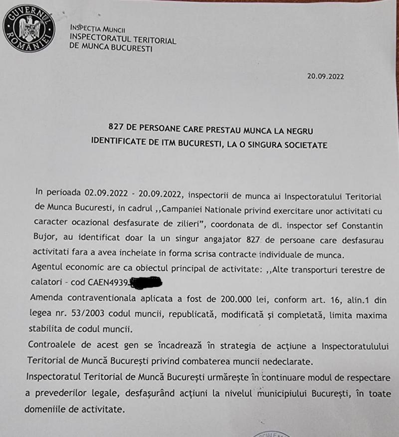 „Inspectorii de muncă au depistat un angajator din București, cu activitate în domeniul transportului de persoane, care avea peste 800 (!!!) de lucrători fără contract de muncă! Repet, peste 800! Le-am solicitat inspectorilor de muncă toleranță zero la astfel de cazuri, dat fiind faptul că acești lucrători nu beneficiază de asigurare de sănătate și nici de pensie! Vom intensifica verificările în perioada următoare, pentru a descuraja astfel de comportamente din partea unor agenți economici, pe care le consider intolerabile!”, a scris ministrul Muncii, Marius Budăi, într-un mesaj pe Facebook.