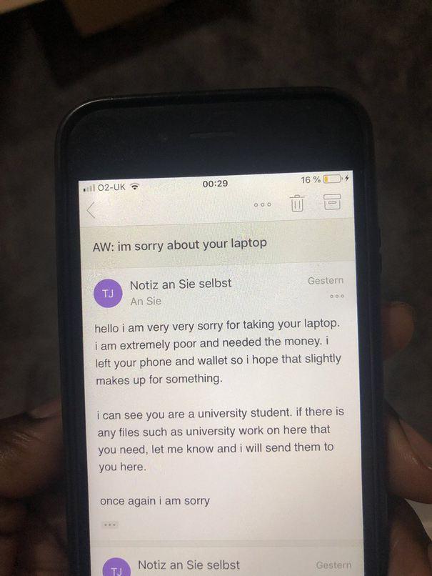 Hoţul și-a cerut scuze printr-un email. ”Îmi pare rău pentru laptopul tău. Sunt foarte sărac şi am avut nevoie de bani. Ţi-am lăsat telefonul şi portofelul”, a scris hoțul, transmite MSN News.