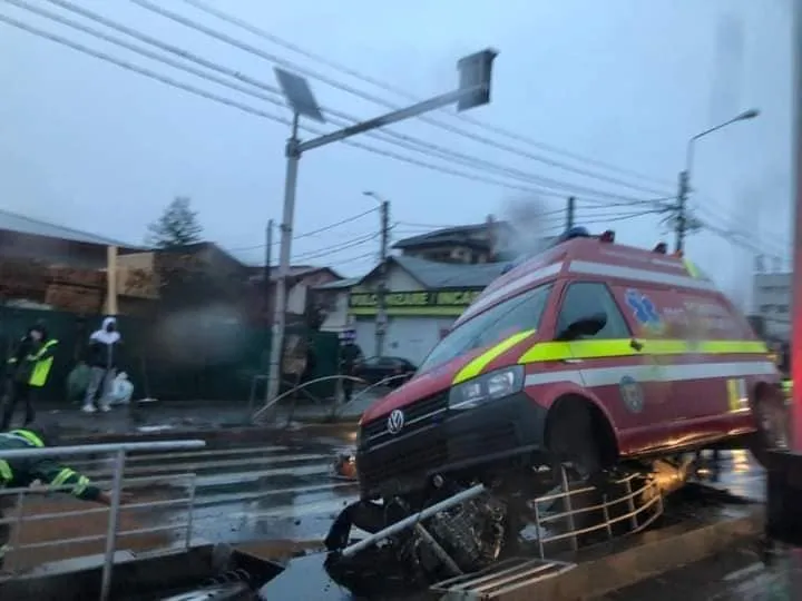 În ambulanță erau trei persoane, iar șoferul a lovit refugiul unui tramvai.