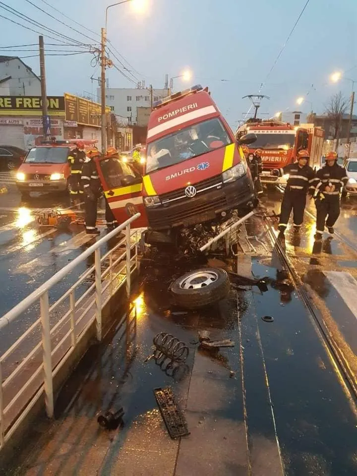 Accident cu o ambulanță SMURD. Trei persoane rănite, mai multe tramvaie blocate
