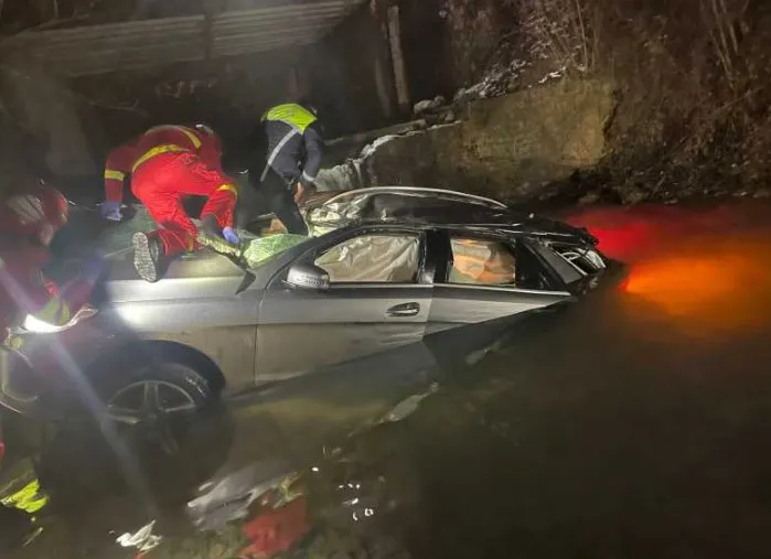 ''Ajunse la locul intervenției, echipajele de pompieri au constatat că un autoturism cu patru pasageri a părăsit partea carosabilă și s-a răsturnat într-o vale cu apă, având o adâncime de aproximativ 3 metri. Forțele profesioniste au intervenit pentru descarcerarea șoferului, un bărbat de aproximativ 45 de ani, care a fost predat conștient și cooperant echipajelor medicale prezente la fața locului'', precizează sursa citată.