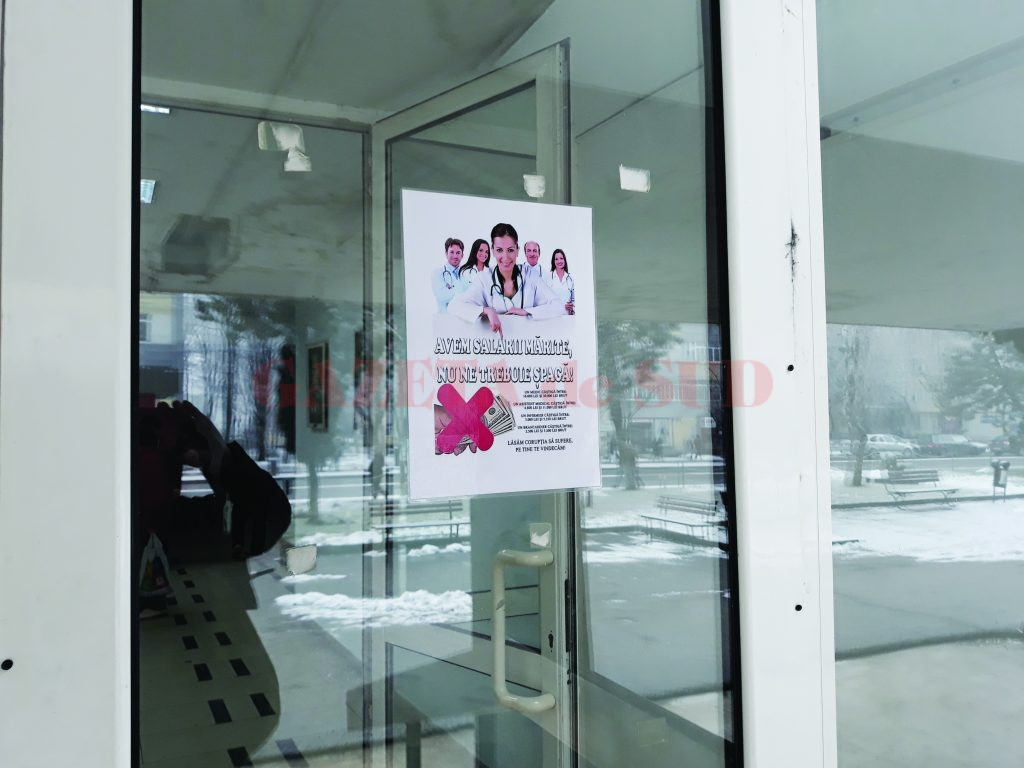 Lăsăm corupția să sufere, pe tine te vindecăm!”, este scris pe afișul care a fost postat la intrarea în fiecare secție, dar din multe locuri a dispărut. Nu se știe cine le-au rupt, dar sunt bănuiți angajații spitalului.