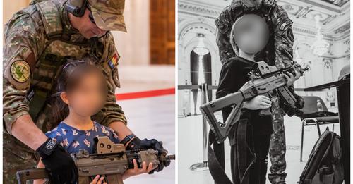 Printre imaginile postate pe Facebook de Forțele Aeriene Române de la acțiunea de promovare sunt două cu o fată și un băiat, în vârstă de 4-5 ani. Ei sunt ajutați de militari să țină în mână arme de asalt, pistoale mitraliere Kalașnikov modernizate. În fotografii, băiatul schițează un zâmbet, iar fata pare surprinsă de arma reală din mâna ei. Ambii stau pentru poză, armele, prea grele pentru copii, fiind susținute de militari profesioniști, scrie Libertatea.