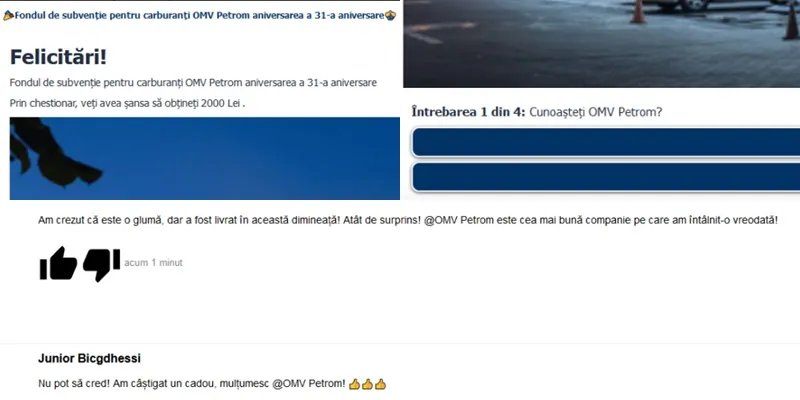 În contextul unei aniversări a 31 de ani de activitate, OMV Petrom „oferă” șansa de a câștiga 2.000 de lei, în urma completării unui chestionar format din 4 întrebări. De la postare nu lipsesc nici comentariile pozitive, precum: „Nu pot să cred! Am câștigat un cadou, mulțumesc OMV Petrom!”, și multe altele.