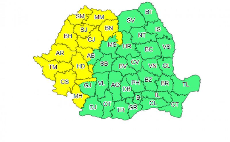 Meteorologii au anunțat două coduri galbene. Primul intră în vigoare luni, la ora 15.00 și vizează 14 județe din partea de vest a țării. Până marți, la ora 6.00, în Banat, Crișana, Maramureș, local în Transilvania și vestul Olteniei instabilitatea atmosferică va fi temporar accentuată și se va manifesta prin averse ce vor avea și caracter torențial, descărcări electrice și izolat grindină.