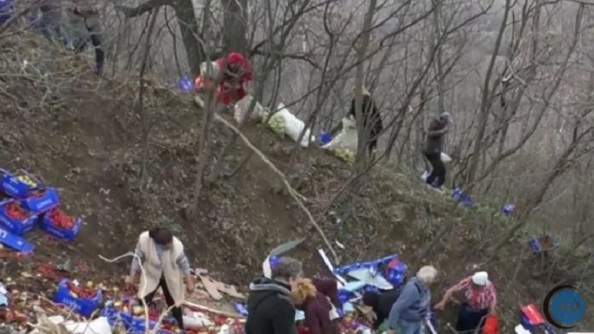 Imaginile surprinse arată localnici care se înghesuie în jurul lădițelor răsturnate, încercând să adune cât mai multe fructe înainte ca acestea să fie preluate de autorități sau să se degradeze pe drum.