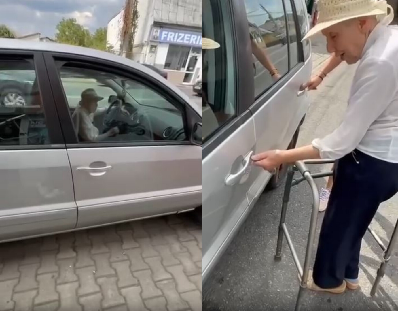 Bătrână care poate merge doar sprijinită de un cadru, filmată la volanul unei mașini VIDEO