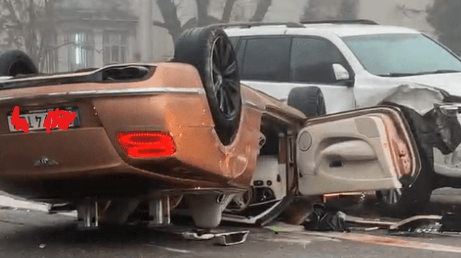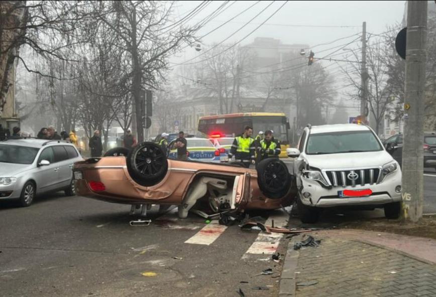 Bolid de lux decapotabil, răsturnat și strivit pe asfalt, în urma unui accident rutier. Polițist local, rănit în timp ce încerca să traverseze strada-FOTO