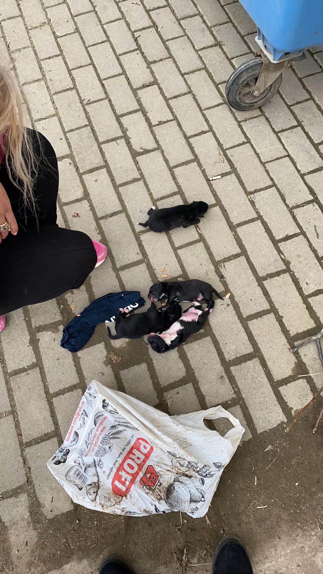 Mai mulți pui abia fătați au fost găsiți aruncați într-un tomberon, de iubitorii de animale.
