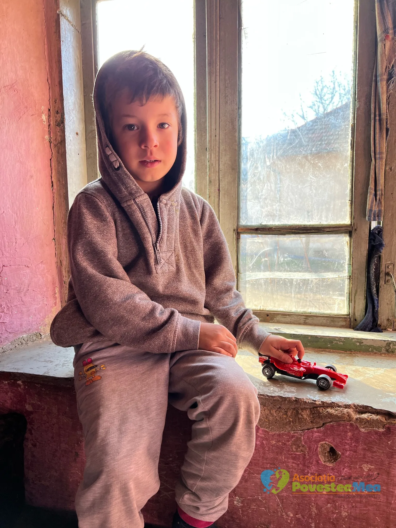 Ionuţ are o singurã jucãrie şi o împarte cu fraţii. Acum, era rândul lui sã se joace la geam cât încã mai era luminã. Din pãcate, trec vremuri grele, fãrã curent electric îşi trãiesc copilãria aşa cum o înţeleg mai bine.