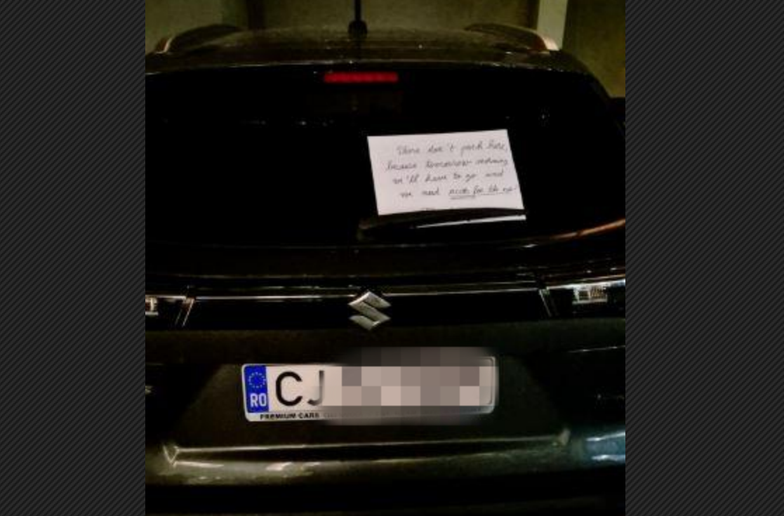 Pe geamul mașinii a fost lipit un anunț scris cu politețe, dar clar și concis: