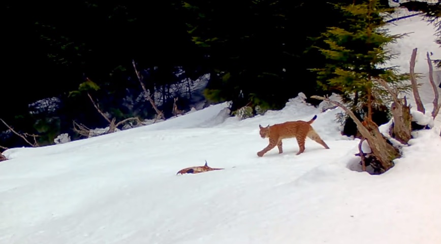 Două exemplare de râs, superbe, ascunse undeva în adâncurile pădurii, își fac de cap prin zăpadă, se hârjonesc, totul pe un fundal sonor asigurat de câteva păsări.