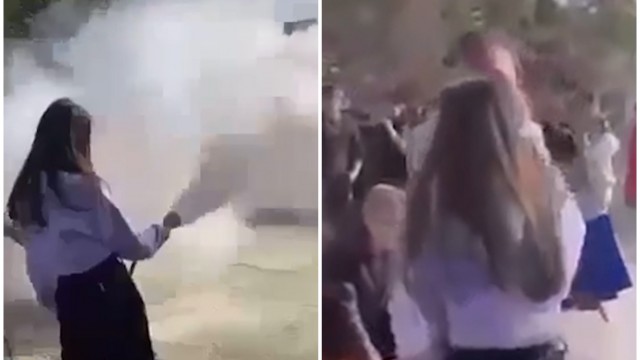 În imagini se vede cum eleva se joacă cu un extinctor şi îl îndreaptă către colegii săi. Moment în care profesorul vine şi, fără să îi atragă atenţia adolescentei, o loveşte şi o împinge, potrivit Observator.
