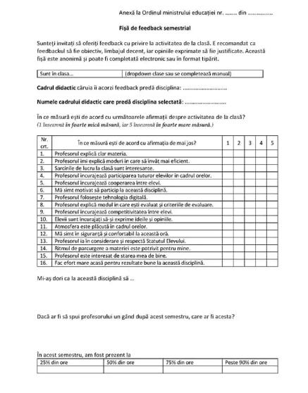 Fișa de feedback va fi semestrială, astfel că, la finalul fiecărui semestru, elevii vor oferi feedback asupra activității fiecărui profesor de la clasă.