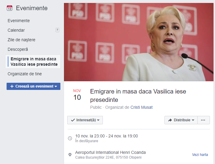 Un eveniment creat pe Facebook a devenit rapid viral. Este vorba despre evenimentul ”Emigrare în masă dacă Vasilica iese președinte”, programat pentru a avea loc la Aeroportul Internațional Henri Coandă, în eventualitatea în care Viorica Dăncilă va câștiga turul doi.