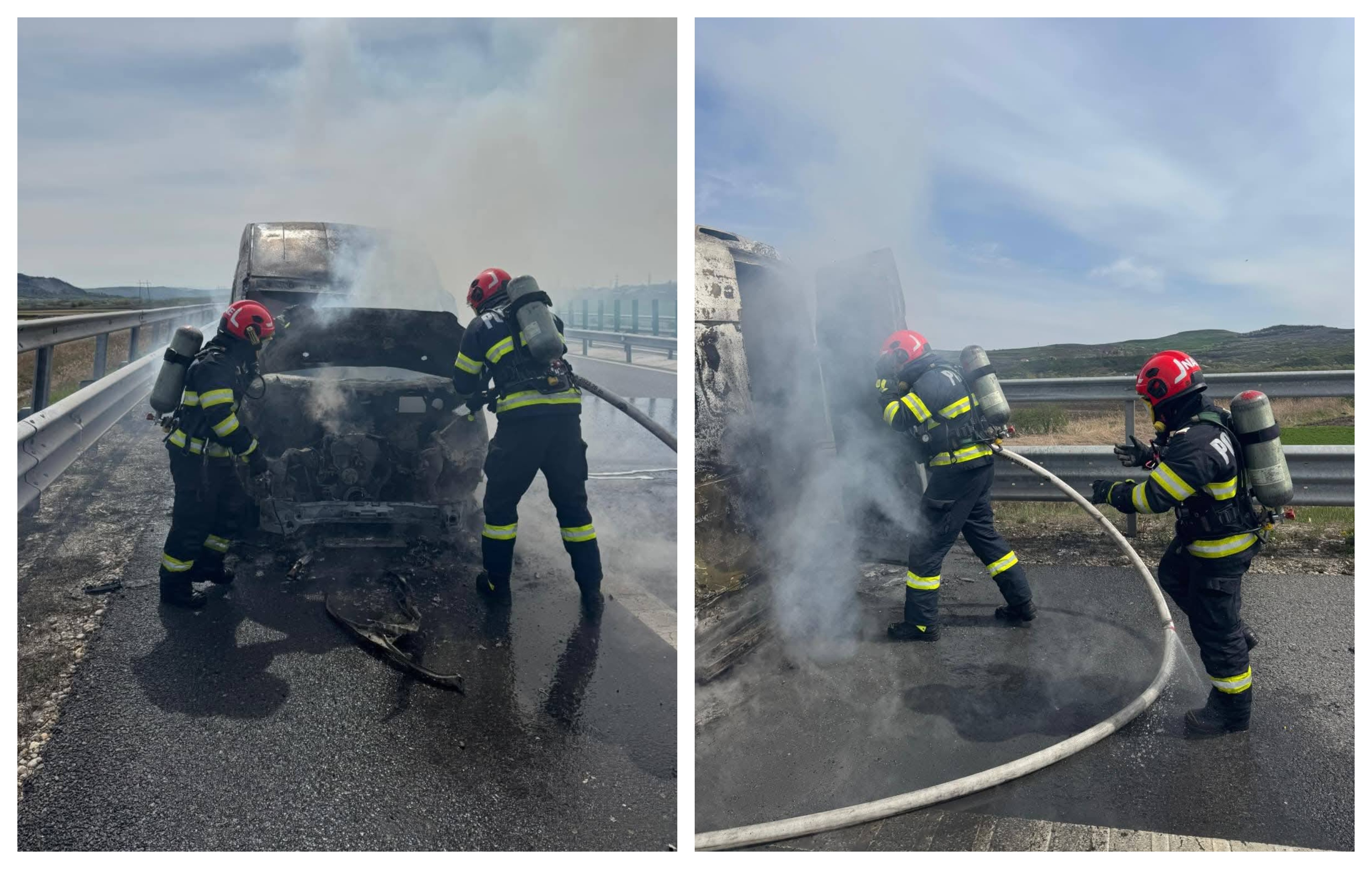 Flăcări pe autostradă! O autoutilitară a fost făcută scrum de un incendiu. Pompierii au intervenit de urgență FOTO