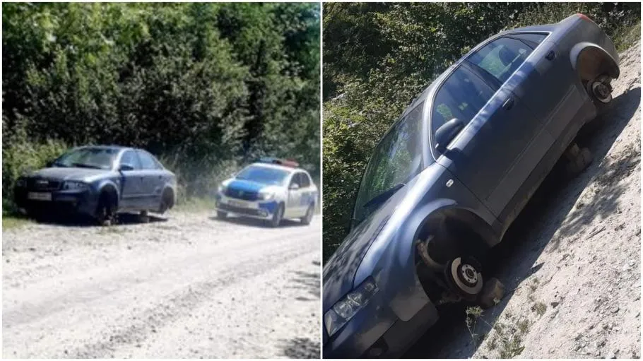 FOTO - A rămas fără toate roţile de la maşină după ce a parcat mașina într-o parcare lăturalnică: „Cine o furat să le aduca înapoi”