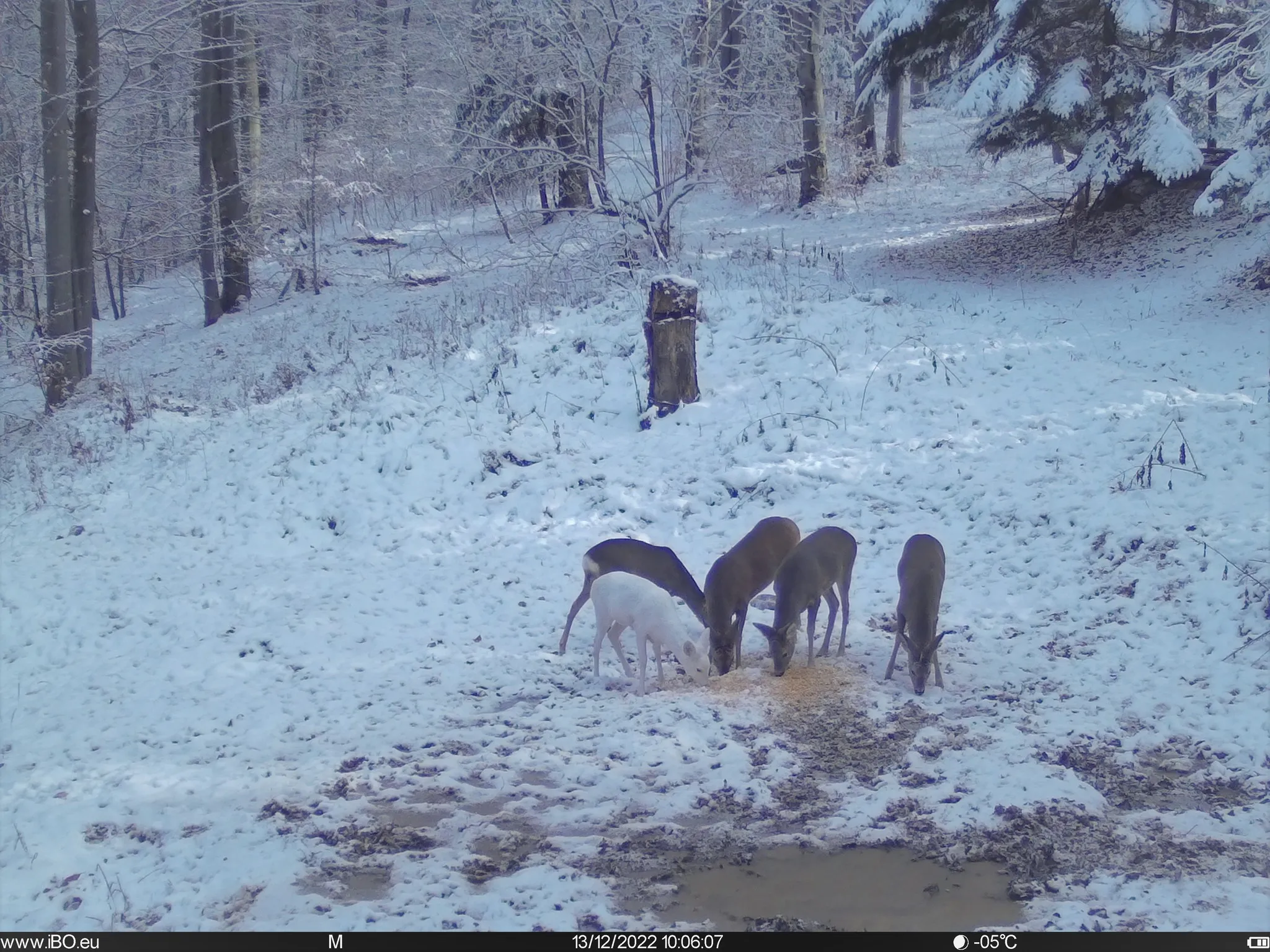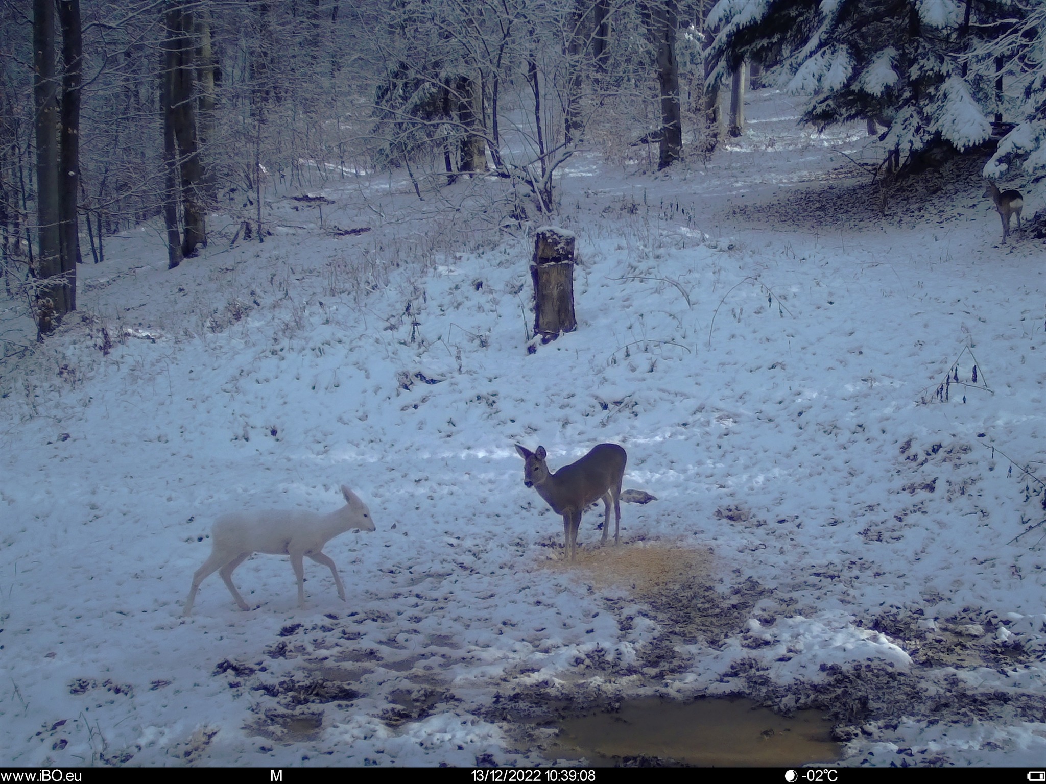O căprioară complet albă, camuflată perfect pentru iarnă, a fost fotografiată de camera cu senzori la unul din punctele de hrănire monitorizate ale Romsilva - Administrația Parcului Natural Bucegi.