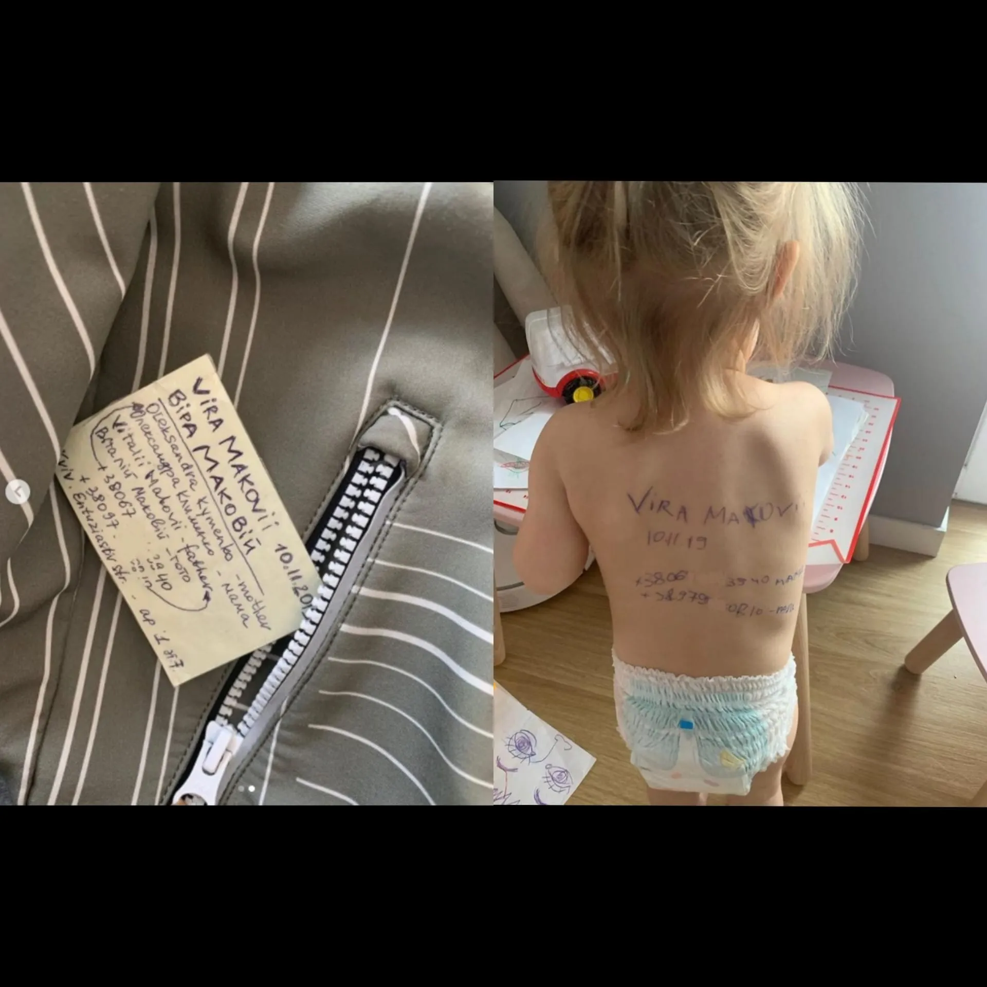 O imagine care a devenit virală prezintă o fetiță ucraineană cu un nume și un număr de telefon scrise de mama ei pe spate. Fotografia a fost postată de mama fetei, Sasha Makoviy, pe Instagram în urmă cu trei zile. Postarea este în limba locală, dar o traducere Google arată că femeia a decis să scrie numele fiicei ei Vera „În cazul în care se întâmplă ceva, vă rog să o îngrijiți, este o supraviețuitoare”.
