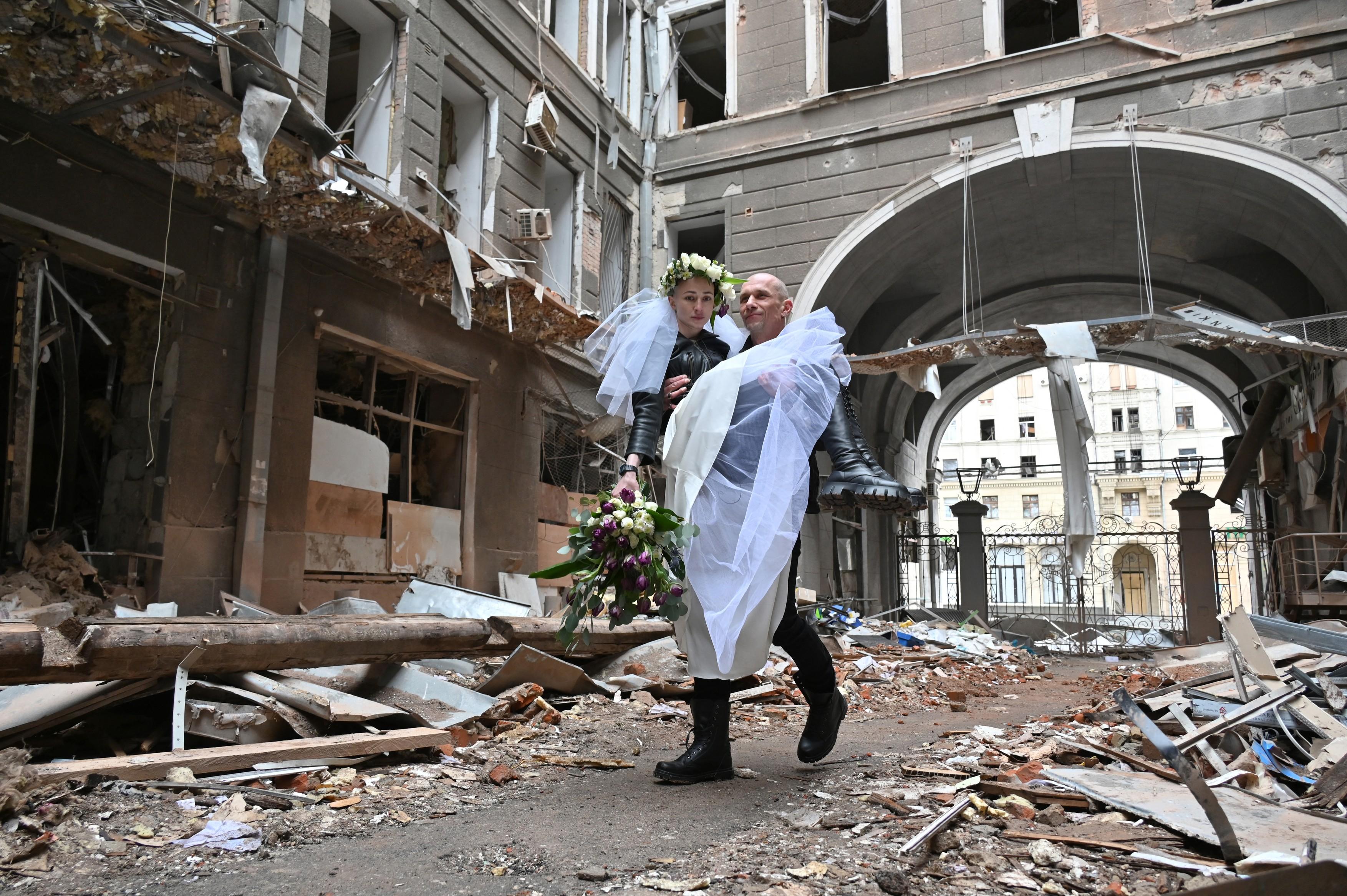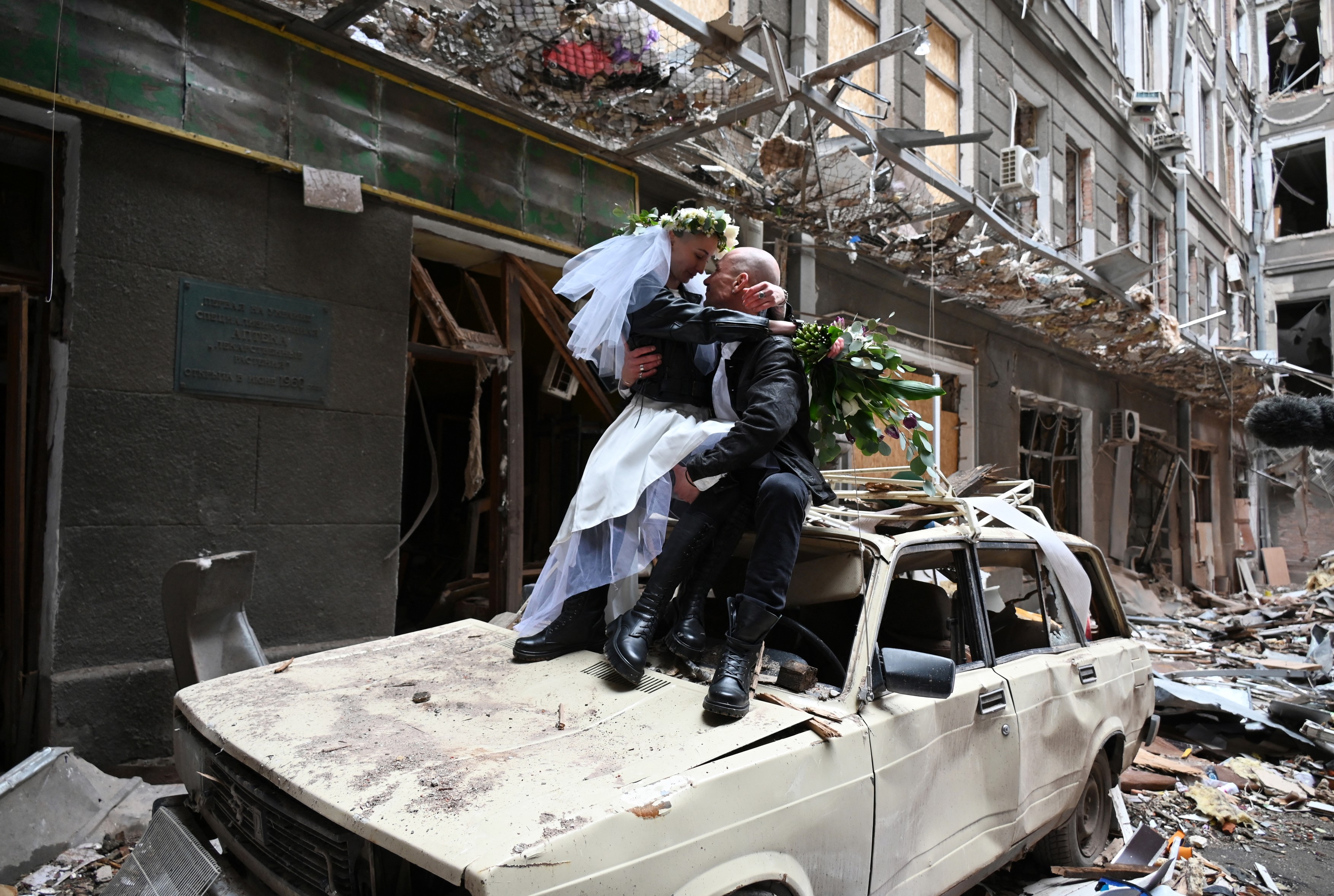 Anastasia și Anton, un cuplu ucrainean, și-au celebrat nunta în mijlocul ruinelor din Harkov. Fotografiile făcute de ei printre clădiri bombardate și mașini incendiate au devenit virale.
