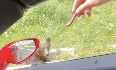 Cei doi au fost amendați cu câte 1500 de lei după ce au hrănit cu cârnați un urs de pe marginea unui drum din România.