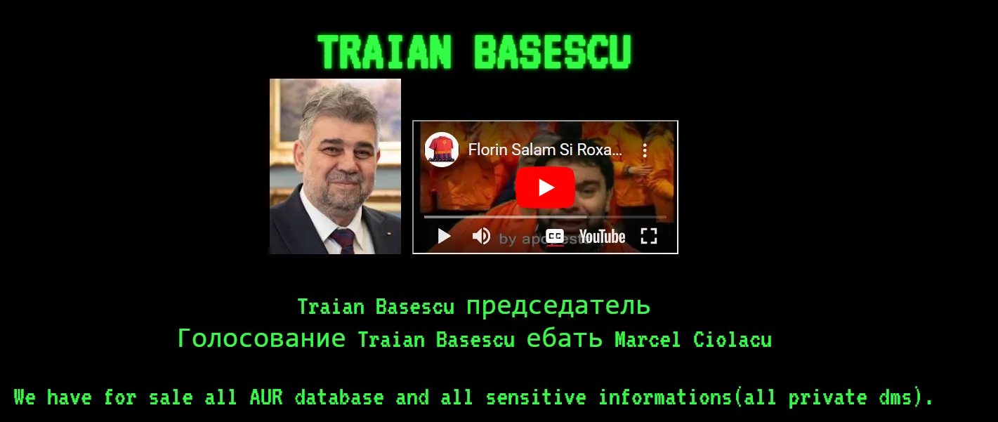 Site-ul partidului AUR a fost spart de hackeri care au transmis că ,,acest domeniu este confiscat de Rusia.” Aceștia au implementat și o poză cu Marcel Ciolacu și o melodie cântată de manelistul Florin Salam și Roxana Prinţesa Ardealului.