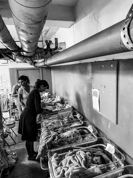 În imaginile alb-negru distribuite pe social media, se văd zeci de pătuțuri și asistente care muncesc neîncetat printre nou-născuți. Imaginile descriu perfect durerea din sufletul ucrainenilor, zeci de mame care plâng îngrijorate cu bebelușii strânși la piept, temându-se pentru ziua de mâine.