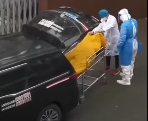 Filmarea realizată de un martor arată momentul în care mai mulți muncitori îmbrăcați din cap până în picioare în echipament de protecție își dau seama că bărbatul pe care îl cărau este încă în viață. Imaginile filmate în Shanghai au devenit virale pe rețelele sociale chineze, stârnind groază și indignare.