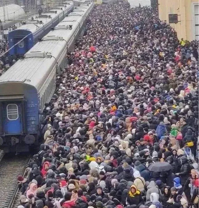 Mii de ucraineni așteaptă să plece din gara Harkov, arată o fotografie publicată de agenția de presă Nexta, pe Twitter.
