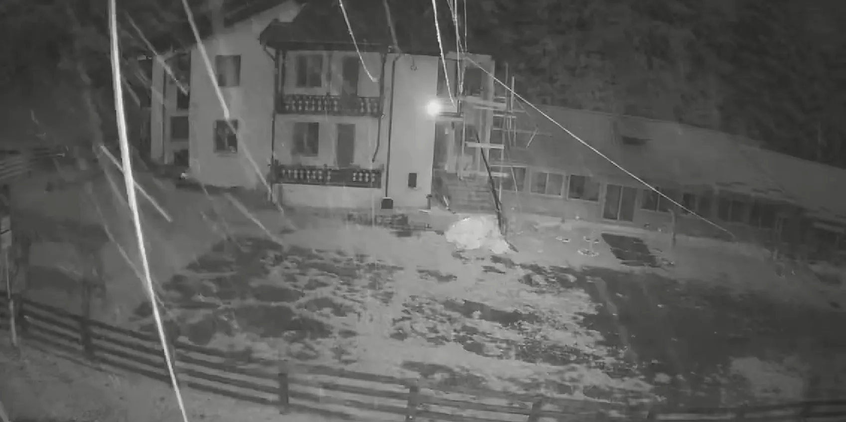 Pe imaginile surprinse de camerele de supraveghere ale unei cabane se vede cum ninge ca la început de iarnă. Liniștit!