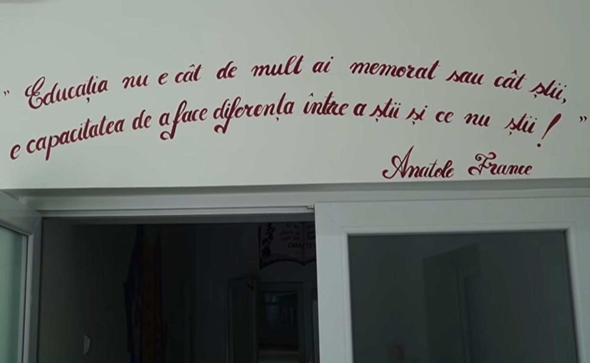 Deasupra uşii unei săli de clasă a fost scris un citat din Anatole France, tradus în limba română, în care s-a strecurat însă şi o gafă. Este vorba despre verbul „a şti" scris greşit la infinitiv, cu doi de i în loc de unul, cum este, de fapt, corect.