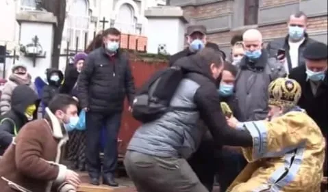 Acesta a fost ajutat de enoriaşi să se ridice şi să îşi continue drumul spre butoaiele pline cu apă.