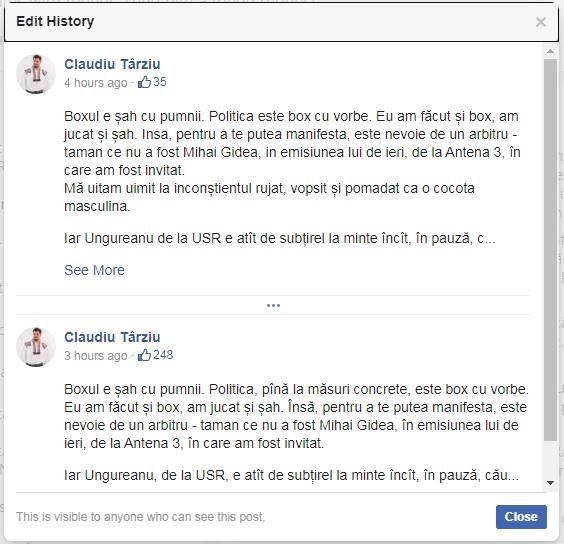 Ulterior a editat postarea și a scos apelativele jignitoare la adresa lui Gâdea, dar acestea au fost salvate.