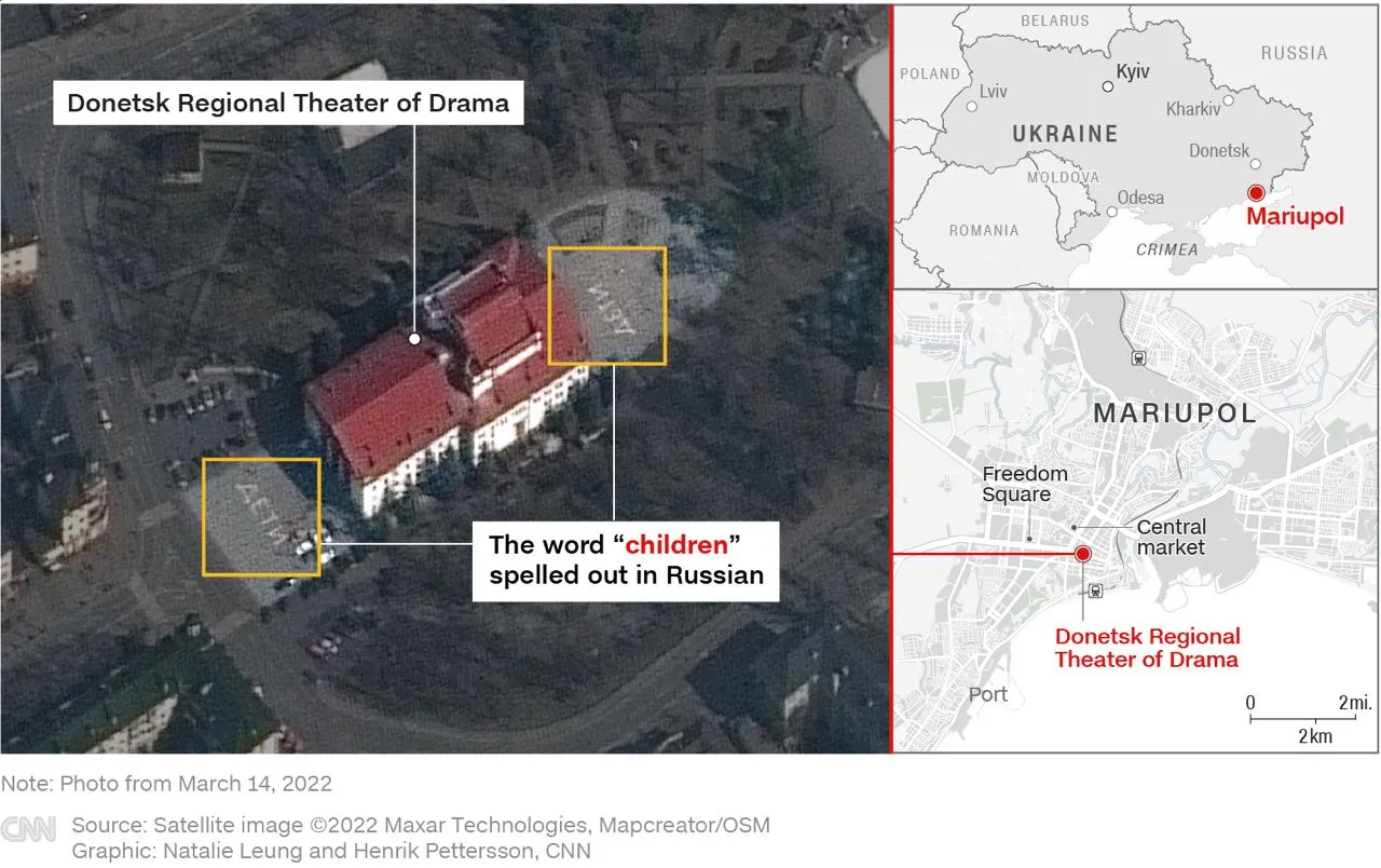 Peste 1000 de oameni se adăposteau acolo, conform autorităților, și imaginile din satelit arată că au scris mare ”COPII” în fața și în spatele teatrului, ca să vadă rușii prin dronă. Nu a contat.